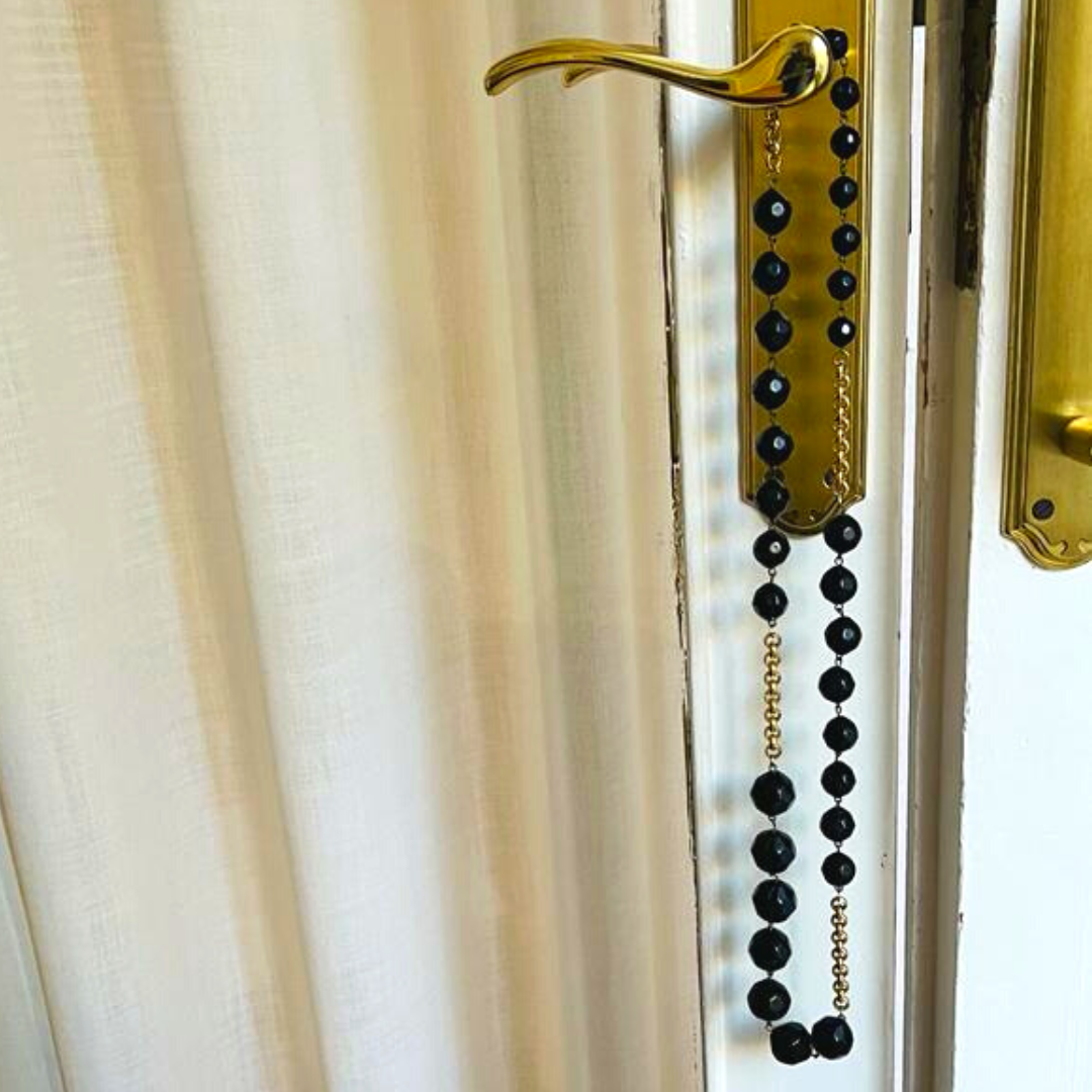 Este collar, negro y dorado, formaba parte de un maravilloso conjunto de piezas de bisutería de los 70. Un collar único para tu fondo de armario